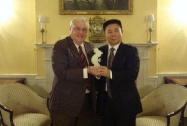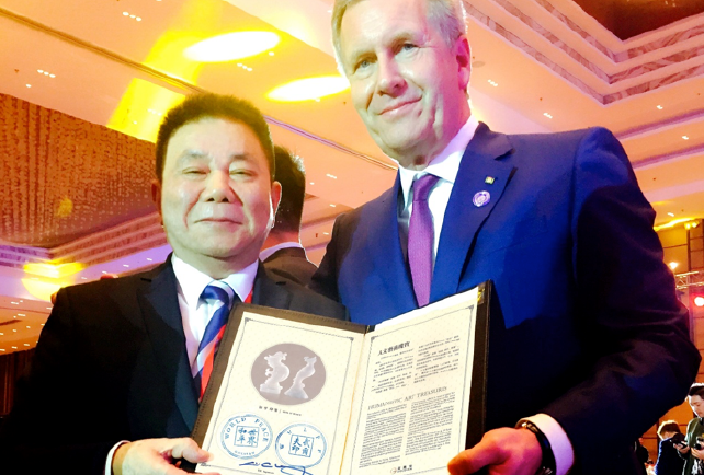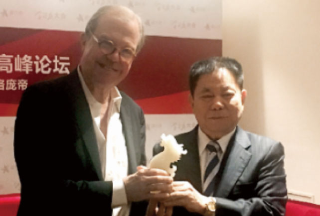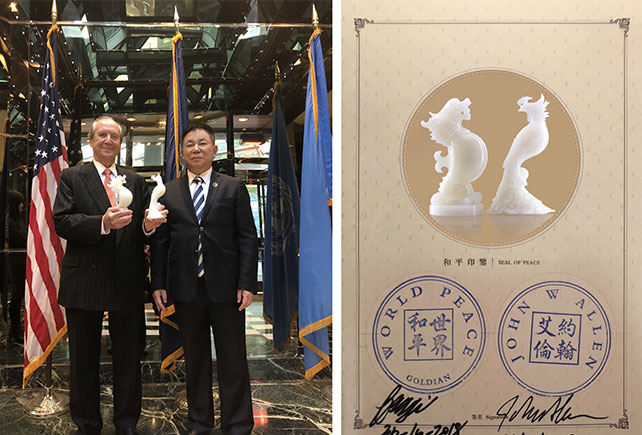 高迪安集团董事长赠与联合国商务理事会前副主席约翰•艾伦先生海马龙、海马凤,约翰•艾伦先生在“和平印鉴”上签字留念