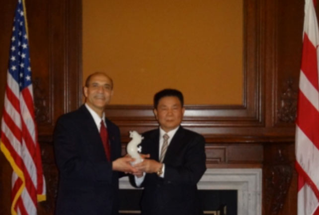 华盛顿市长格雷先生在海马龙和平印鉴上签字留念,华盛顿副市长代格雷先生接受获赠的海马龙瑰宝。