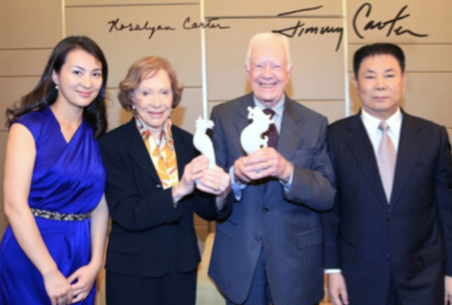 高迪安董事长顾文元先生向美国前总统卡特夫妇赠送海马龙、海马凤,寓意他们“天生一对”,并在海马龙和平印鉴上签名留念。