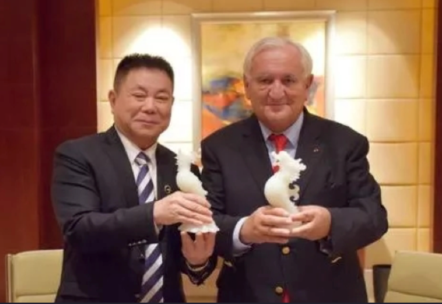 顾文元先生与法国前总理让-皮埃尔·拉法兰(Jean-Pierre Raffarin)先生亲切会面。赠与人文艺术礼品海马龙印鉴。