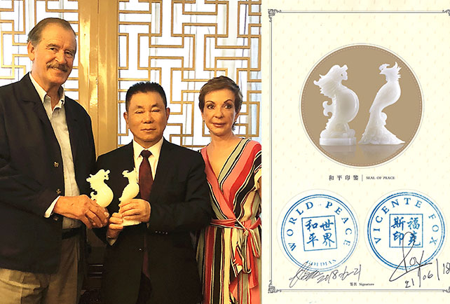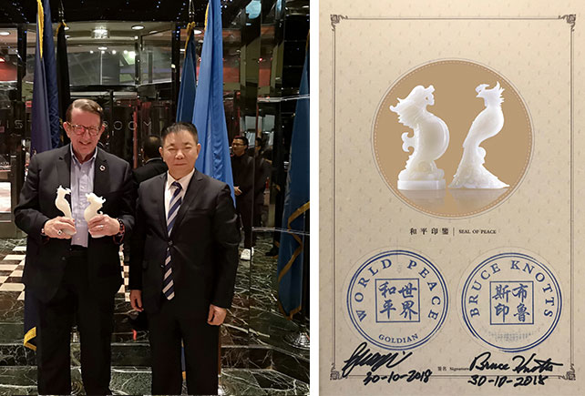 高迪安集团董事长赠与联合国非政府组织委员会主席布鲁斯•诺茨先生海马龙、海马凤,布鲁斯•诺茨先生在“和平印鉴”上签字留念